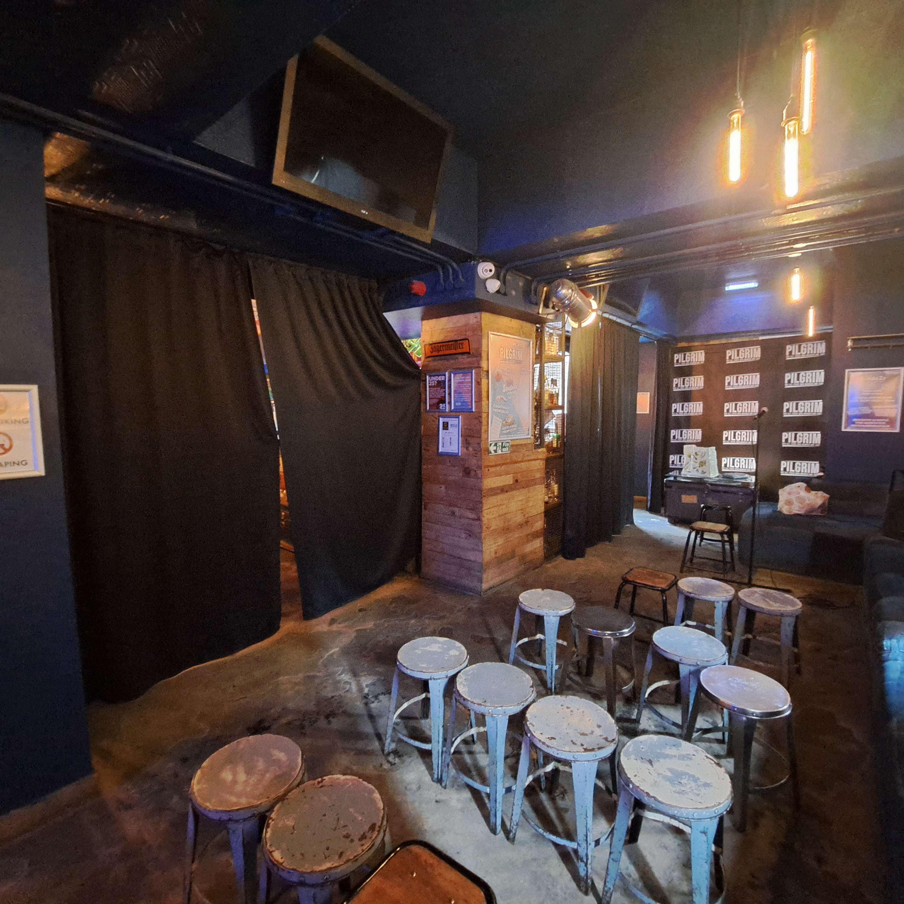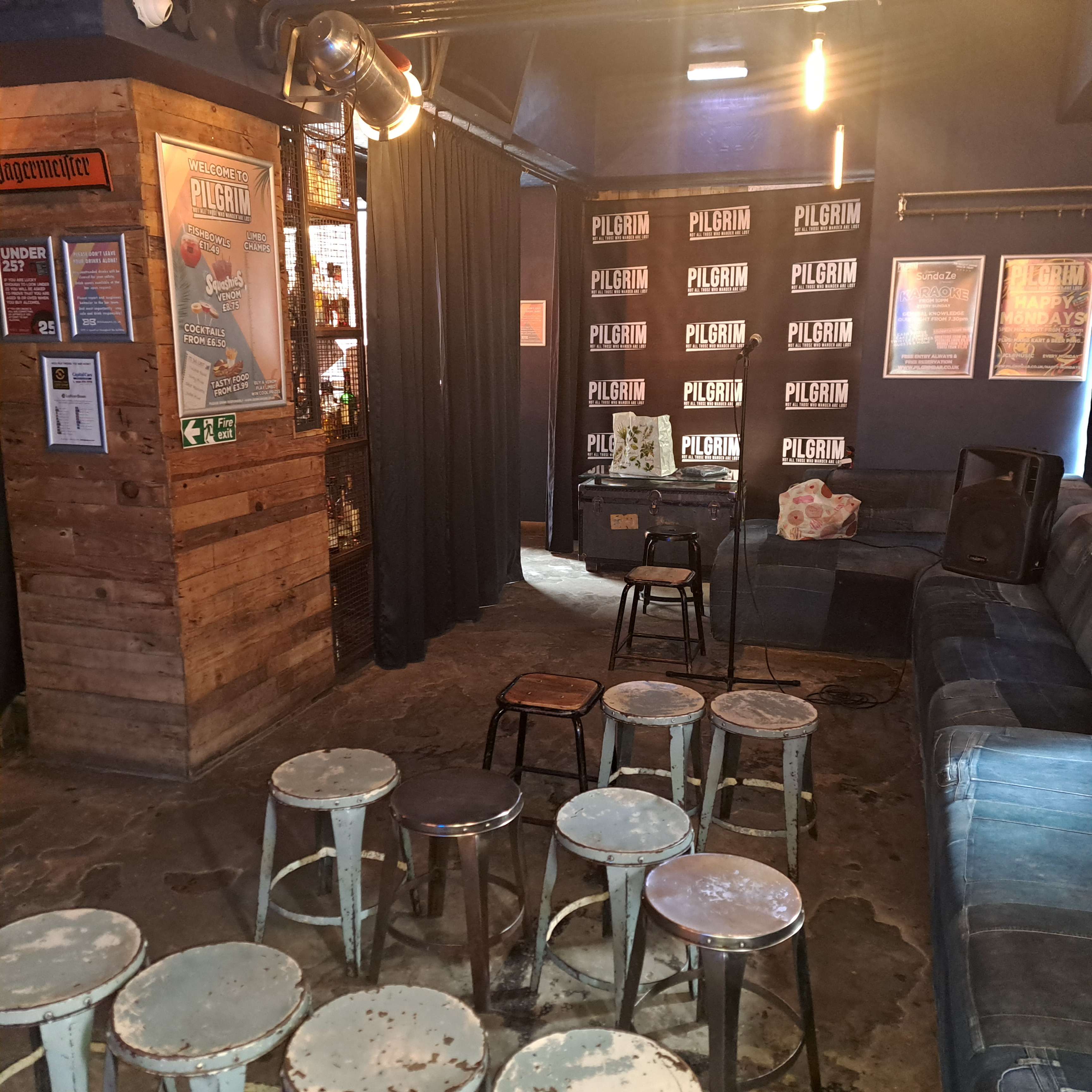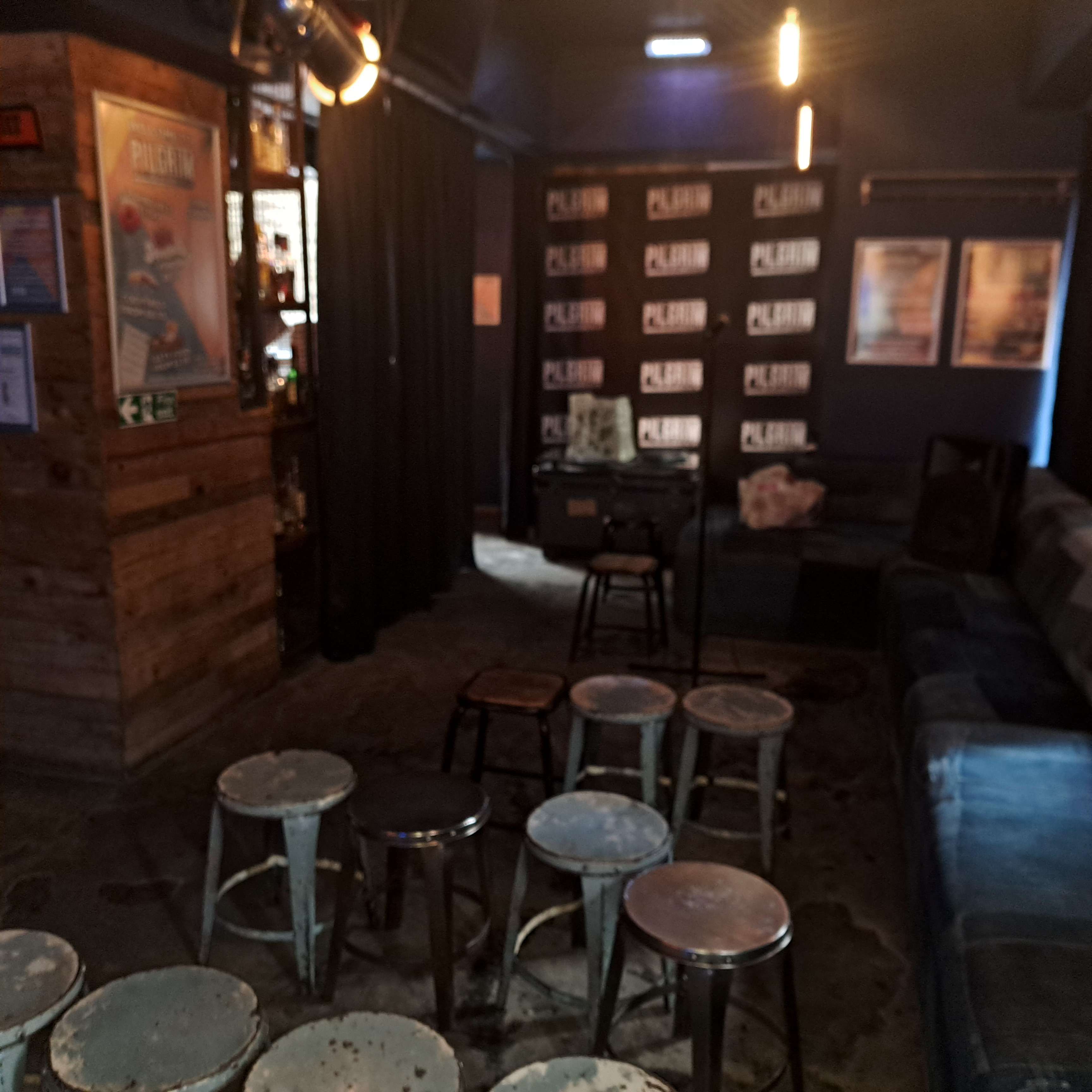 First time doing an Edinburgh run with PBH. I ran my show for 1 week, 19th-25th. Show time was noon. While this was a good time in theory, it wasn't great for getting over from Glasgow each day, and enough time to flyer and set up my multimedia show. I hussled. I had decent audiences most days except Tuesday and Wednesday. There is nowhere to store equipment so if you have any/props you have to take everything in and away per show. One day of my show the TV screens were still on and I could see the audience looking up, distracted, but my tech was on it. It was an error and the staff apologised so no biggie, just make sure you check this. If you want donations make sure you set this up as people will just leave. I laid out a bit at the curtain area and as the week went on my tech did it for me which took awkwardness out of me asking. There was a show on after mine so I was mindful to finish on time, and clear out. 12noon is the first show time so you do have good time to set up and you can ask the bar staff to get in a bit earlier which eased my first day anxiety. The staff were great. They accommodated my asks with grace. I left them a tip at the end of my run, bought them a drink (of water) each day. I'm that kinda gal. My set up was a screen, projector on a stand. My tech, laptop, my props. I needed 3 of their higher chairs to set this up so the audience could see the screen ok. Then finally I had the mic and stand provided, which I had no issues with. I had my show filmed on the last day from more than 1 camera position and it worked quite well when I got the video through. Only downside for clear filming was lighting the 'stage' area. It's a good size room, 30 capacity. Stools are possibly problematic as I skew an older audience so most folk sat along the seating to the left along the room, so that's something to factor in. Would I go back to Pilgrim? For next year I will look at a venue with screen, just because of the faff and small stage area.