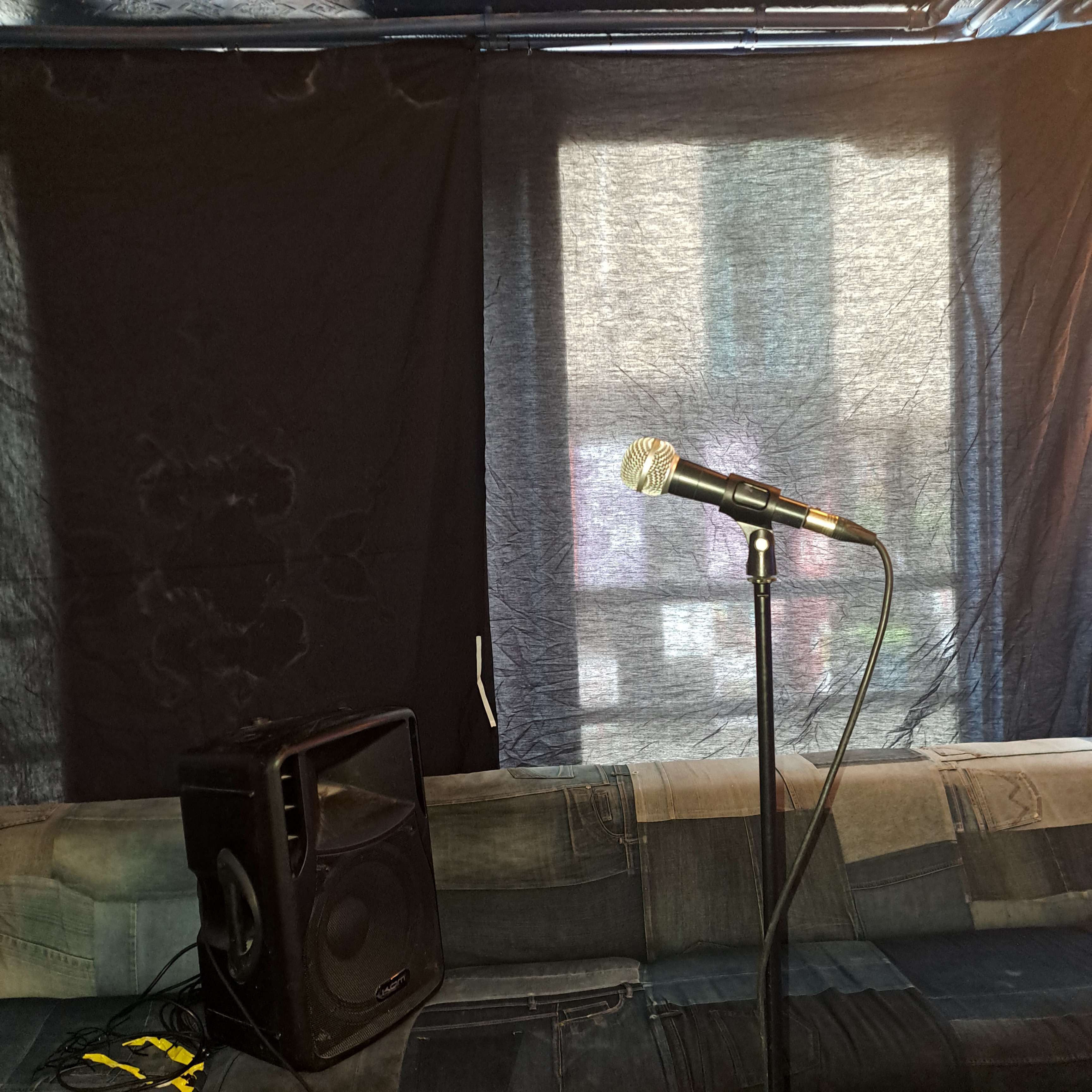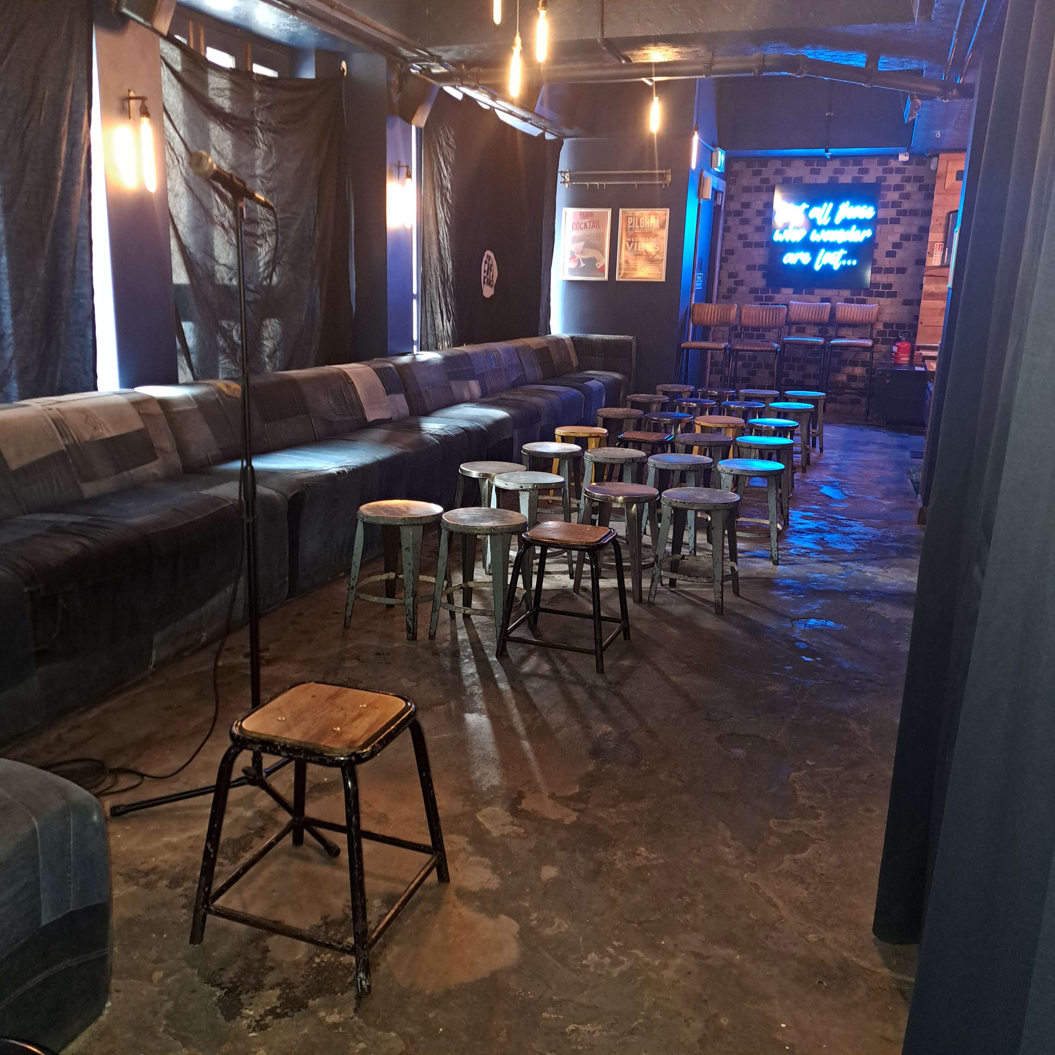 Show: Harun Mushod: Why I Dont Speak To People About Terrorism (show 114) Dates: 3 - 25 August Time: 2.20pm Third year for this show but first time in this venue, having spent the last 8 years in Legends Downstais space. I was the venue captain. The venue holds around 40. It's a bit long, but caused me no problems on full days. It needs one speaker, and a speaker stand is essential. I borrowed one from one of our old venues, Legends, for the duration of the Fringe. Next year, a speaker with an aux output that wasn't broken would be helpful, but the workaround is to use the venue's background music system to which one can plug in a phone or tablet through an earjack. As some of the speakers for that system are in the performance area it worked fine in place of an aux input in our speaker. No photos as I forgot to take them, but the "room" is a curtained off area at one end of the main bar. Seating is one fixed long sofa against one entire wall, and then small stools in 7 rows of four. Problem is that the stools are uncomfortable so everyone sits on the sofa if they can creating one line of audience going away from you. Some perfomers moved their performance area. I tended to block the back rows of stools and sofa to force smaller audiences to sit in rows and toward the front, however, it would be better if the Free Fringe or the venue were able to provide proper chairs in future.